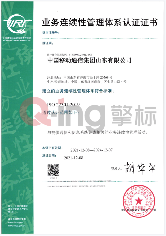 近日,在擎标顾问团的辅导下,中国移动通信集团山东有限公司顺利通过了ISO22301业务连续性管理体系认证,有效的证明了中国移动山东公司可持续的、可信赖的业务服务能力,以及可以为用户持续提供更成熟和更高质量的产品及服务的最高级保障,也是中国移动山东公司承诺客户满足业务持续性的最佳证明。