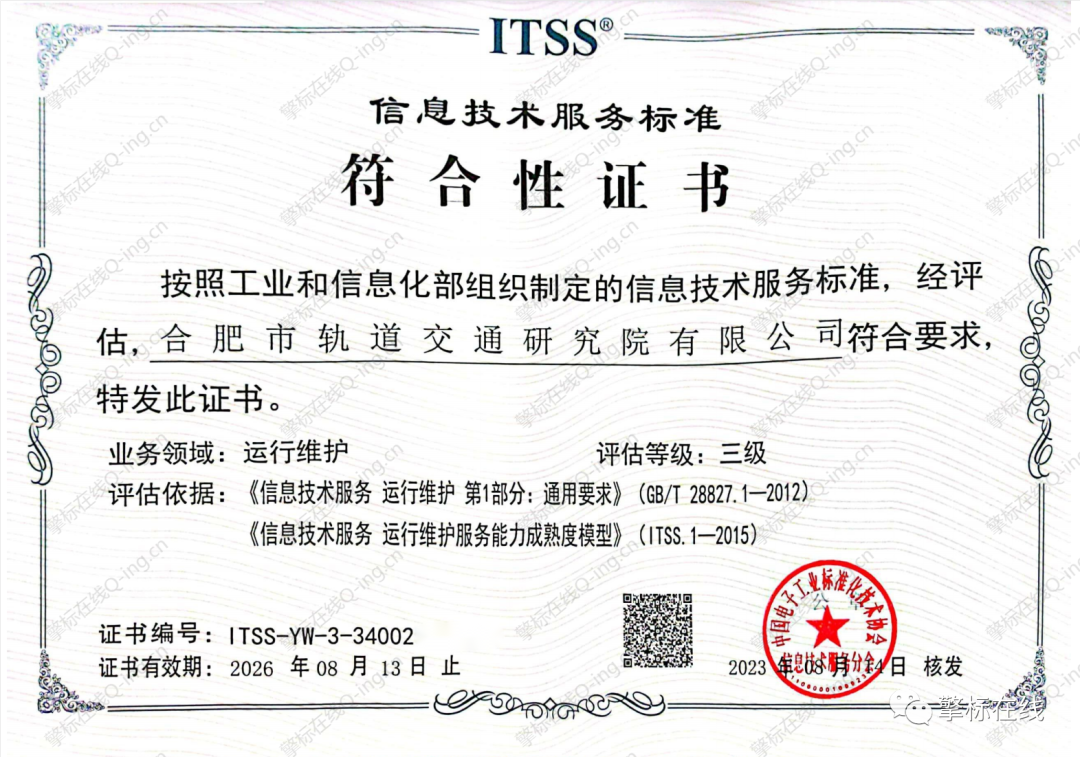 近日,经中国电子工业标准化技术协会信息技术服务分会评估,合肥市轨道交通研究院有限公司凭借领先的技术实力和专业的服务能力,顺利取得了《信息技术服务标准(ITSS)运行维护符合性三级证书》,标志着合肥轨道运维服务在人员、资源、技术、过程、服务交付与应急响应等方面已具备专业化、系统化的信息技术服务能力,符合国家认证标准,可为用户提供更安全、更稳定、更高效的信息技术服务。
